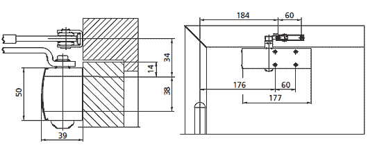 Horní ramenový zavírač (samozavírač) pro 1-křídlé dveře se připevňuje na dveřní křídlo a zárubeň.