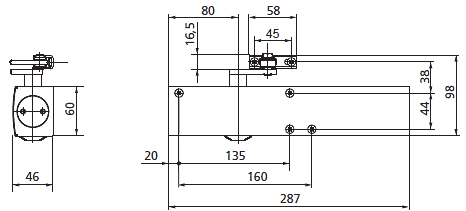 Horní ramenový zavírač (samozavírač) pro 1-křídlé dveře se připevňuje na dveřní křídlo a zárubeň.