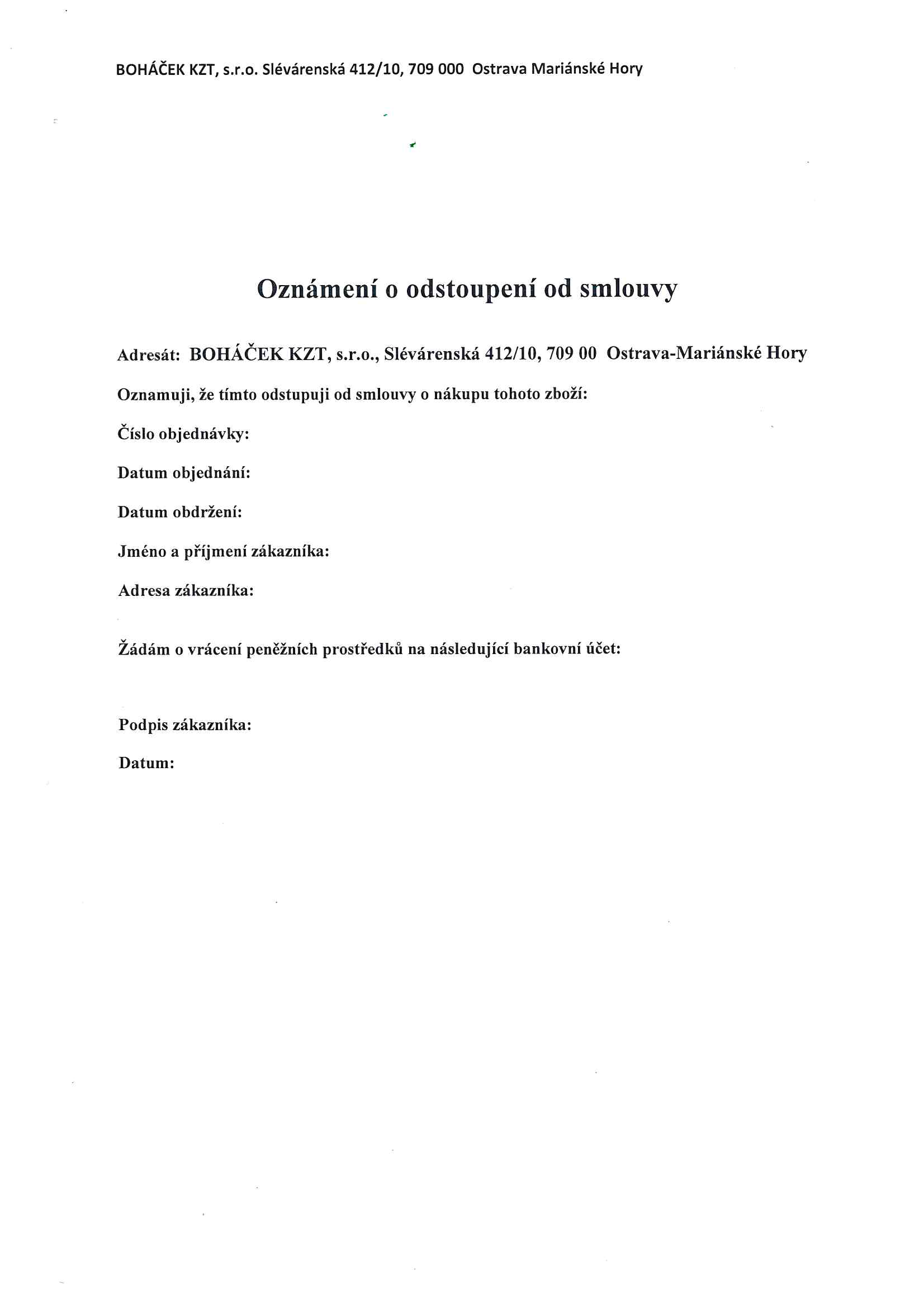 Pokud již zákazník zboží obdržel a převzal, prosíme, aby poslal zboží zpět do provozovny dodavatele ( BOHÁČEK KZT, s.r.o. Slévárenská 412/10, Ostrava Mariánské Hory, 709 00), bez známek užívání nebo opotřebování. Dodavatel bez zbytečného odkladu posoudí stav vráceného zboží.