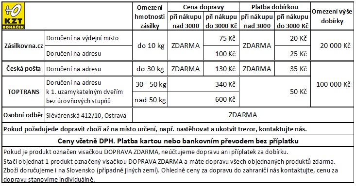 - Zásilky nad 30kg odesíláme smluvní přepravní službou (Sběrná služba TOPTRANS). Zboží označené visačkou DOPRAVA ZDARMA (např. trezory, sejfy, skříně) vám bude doručeno zdarma na dodací adresu k prvním uzamykatelným dveřím (bez úrovňových stupňů: schodů apod.). Pokud máte zájem o službu nastěhování (případně i montáže), kontaktujte nás, provedeme individuální nacenění dle vašich požadavků